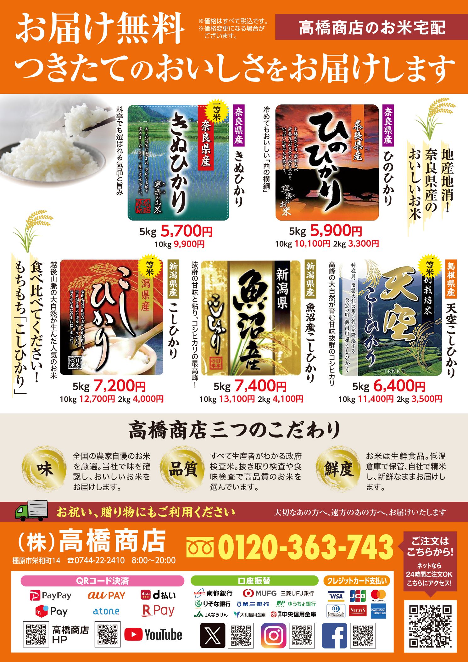 高橋商店では、奈良県産きぬひかり・ひのひかり、新潟県産こしひかり・魚沼産こしひかり、島根県産 天空こしひかりなど、全国の産地から厳選したおいしいお米を配達無料でお届けしています。